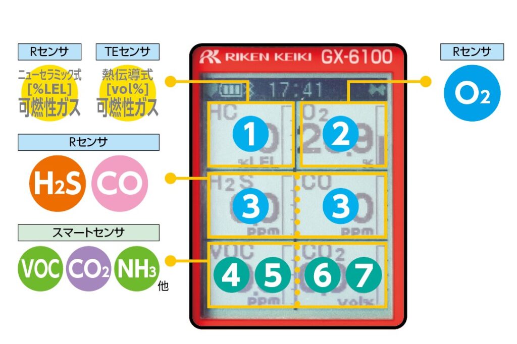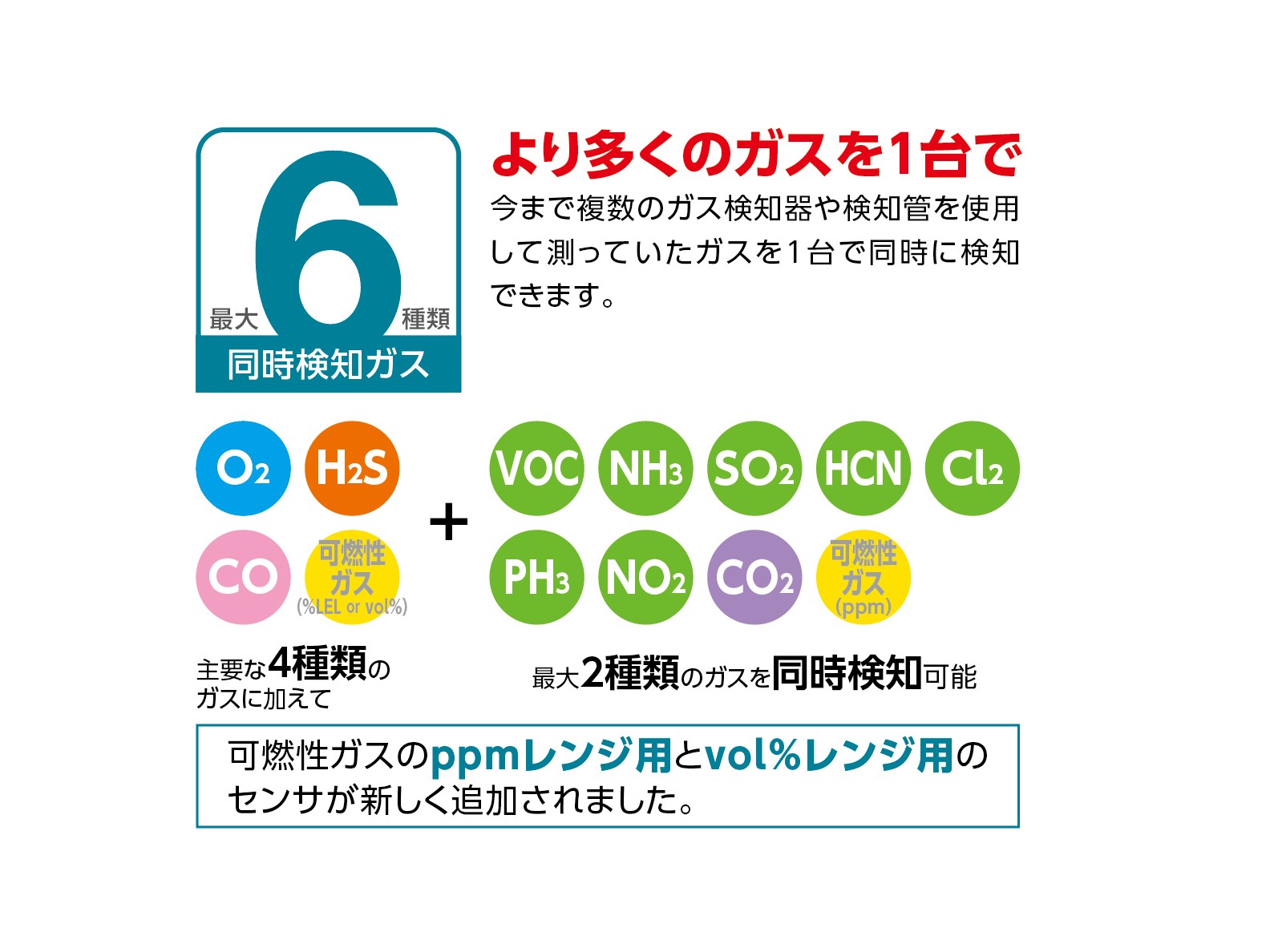 ・可燃性ガス、酸素、一酸化炭素、硫化水素に加え、